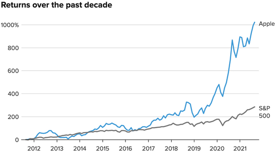 如果投资者在库克接任苹果公司CEO的首日购买了该公司股票,他们会很高兴。如果2011年8月24日在苹果股票上投资1000美元,截至本周一其价值将超过16866美元;如果将所有股息再投资,年回报率将超过32%,同期标普500指数的年回报率仅略高于16%。