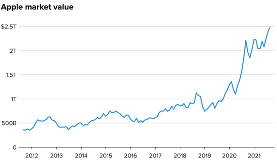 苹果公司是市值最高的上市企业,市值从乔布斯辞职那天的约3500亿美元增长到如今的近2.5万亿美元,超过了微软和亚马逊等其他科技巨头。