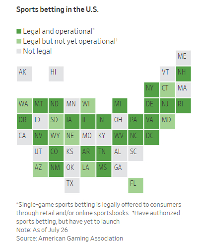 现在,32个州和哥伦比亚特区已经将体育博彩合法化,每个州都有各自的规则和监管机构。其中10个州还不允许赌博。
