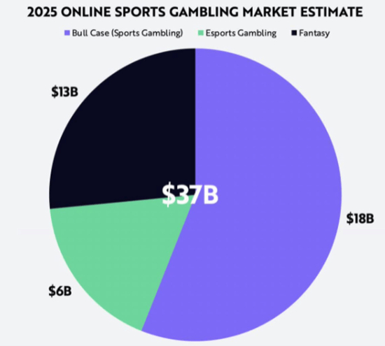 ARK在其报告中提到:“根据我们的研究,在未来五年内,随着在线体育博彩的赌注总额规模从大约180亿美元增长10倍至1800亿美元,三大体育博彩类别加在一起可以产生31%的复合年增长率,同时将在线体育博彩类别市值从去年的95亿美元增加到2025年的370亿美元。”