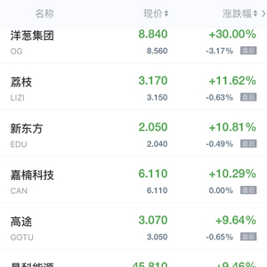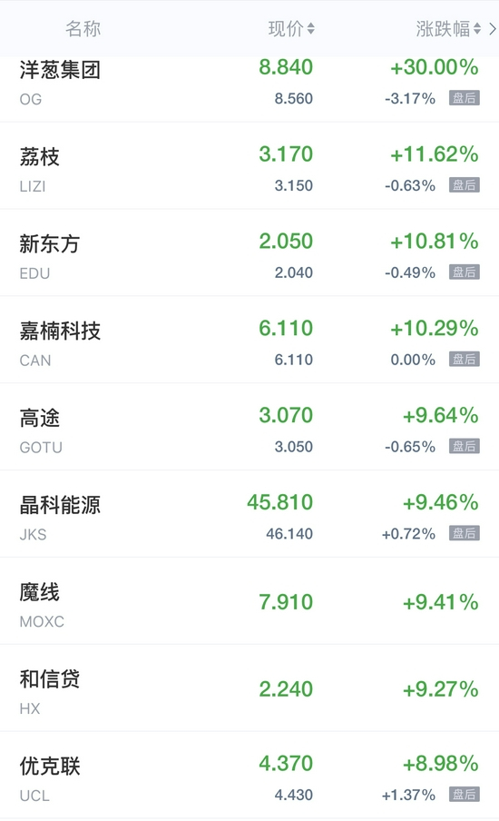 洋葱集团大涨30%,荔枝涨超11%,新东方涨近11%,嘉楠科技涨超10%,好未来涨近10%,高途、晶科能源、和信贷涨超9%,优克联涨近9%,斗鱼涨超6%,趣头条、人人公司、知乎涨超5%,房天下、虎牙、网易涨超4%,爱奇艺涨近4%,携程、微美全息、汽车之家、世纪互联、迅雷、搜狐、优信、贝壳、一起教育涨超3%,哔哩哔哩涨近3%,微博、第九城市、老虎证券涨超2%,拼多多涨近2%,百度、唯品会、陌陌涨超1%,京东涨近1%。