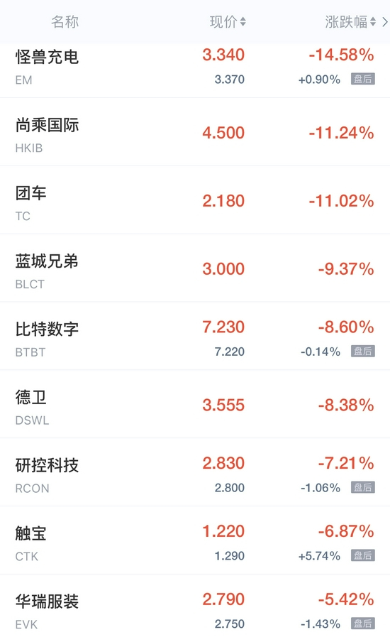 怪兽充电跌超14%,团车跌超11%,蓝城兄弟跌超9%,比特数字跌超8%,中网载线、云米科技跌超1%。