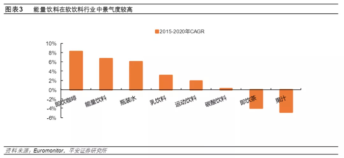 根据Euromonitor数据,2015-2020年碳酸饮料、茶饮料、果汁品类CAGR分别为0%、-4%、-5%,呈下滑趋势;而即饮咖啡、能量饮料、瓶装水等品类保持较高景气度,2015-2020年CAGR分别为8%、7%、6%。