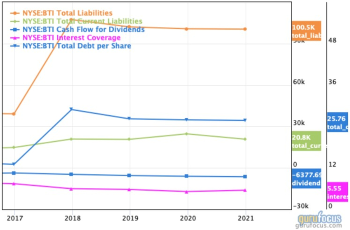 英美烟草在2017年以860亿美元收购雷诺兹烟草公司(Reynolds America)后,债务负担相当沉重。该公司债务负担的大幅增加反映在1.32的糟糕Altman-Z分数上(Altman-Z分数是由一家公司的“信用强度”测试的输出,该模型评估了上市公司有无破产的可能性)。该公司在其他债务和长期负债指标方面得分很低,在烟草制品行业统计的37家公司中,以债务股本比排名,低于78.38%的公司。行业中值为0.06,而英美烟草的比率为0.72。