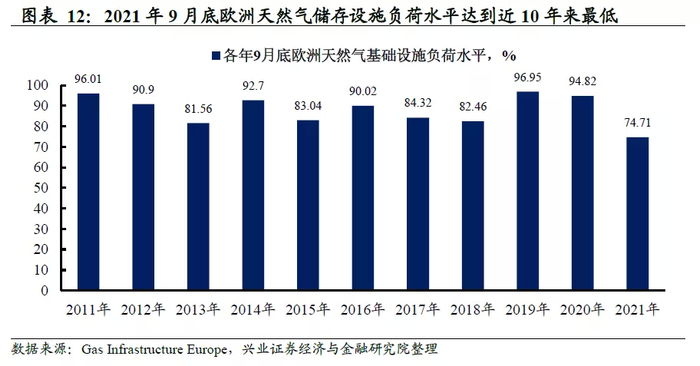 2020年欧洲经历冷冬,取暖需求上升,消耗天然气库存。2020年冬季,欧洲经历冷冬,气象观测数据显示2020年12月-2021年5月期间,俄罗斯、英国各月最高温度较往年同期平均温度要低2-5度左右。冷冬影响社会取暖需求上升,与此同时,由于产能处于收缩状态,供给跟不上,导致欧洲能源库存消耗明显。从欧洲天然气库存数据看,2020年-2021年之交的冬季,欧洲天然气库存出现明显消耗,至2021年5月底库存水平明显低于过往两年。不同于2019年库存消耗后经历快速回补,2021年5月以来,欧洲天然气库存虽然也有回补,但库存快速消耗形成的约400Twh的缺口,一直没有回补修复。从欧洲天然气基础设施负荷情况看,2021年9月底,欧洲天然气储存设施的负荷水平仅为74.7%,为2011年最低水平,而在疫情之前的2019年这一数值高达97%。