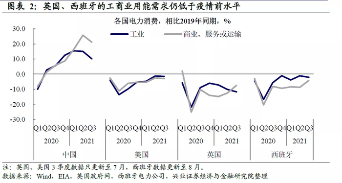 需求端来看,疫情后的经济恢复阶段,欧洲能源需求并未明显增加。当前欧洲最“缺”能源的英国、西班牙,工商业能源消耗低于疫情前,需求未明显增加。在欧洲能源价格飙涨之后,一种声音认为是由于今年欧洲经济复苏较快,进而导致能源需求大幅增长。然而,如果不考虑需求相对稳定的居民端(当然,居民端会受天气变化影响,下面也会分析,今年欧洲天气导致1季度居民天然气需求上升),与经济复苏更为相关的工商业的能源消耗并没有大幅增长。对比中美经济恢复期间的能源需求来看,2021年中国无论是工业还是第三产业电力消费都大幅超过2019年同期10%~20%;美国当前能源消耗也基本回到2019年同期水平;但英国、西班牙仍明显低于2019年同期水平。