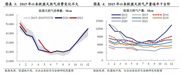 供给端来看,近年来欧洲天然气产量逐年下台阶,供给问题更加严重。从当前欧洲涨价最剧烈的能源——天然气的情况来看,2015年以来,欧洲每年各月的天然气消费规模变化并不大,即使是在疫情冲击严重的2020年以及经济快速恢复的2021年,欧洲各个月份的天然气消费规模整体处于2015-2019年的区间之内。但从供给端来看,2015年以来,欧洲天然气生产规模呈现逐渐下台阶趋势,能源供给问题显然更加严重。