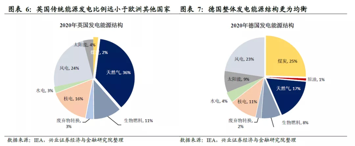 本次能源危机“震中”英国,其能源结构较欧洲其他国家更不均衡。从发电能源结构来看,2014年之后英国的煤炭发电占比快速下行,天然气、风能的发电占比则迅速走高。截至2020年,英国最主要的发电能源为天然气(约占36%),其次为风电(约占24%),而煤炭的占比仅为2%。而德国的发电能源结构相较于英国则更为均衡。德国发电能源中煤炭发电约占25%,风电发电约占23%,天然气发电约占17%。这也意味着,英国相较于德国等其他欧洲国家,其能源供给更容易受到天气因素和天然气供应问题的影响,这也是为什么本次能源危机受灾最严重的国家为英国,但德国受到的影响则相对较小。