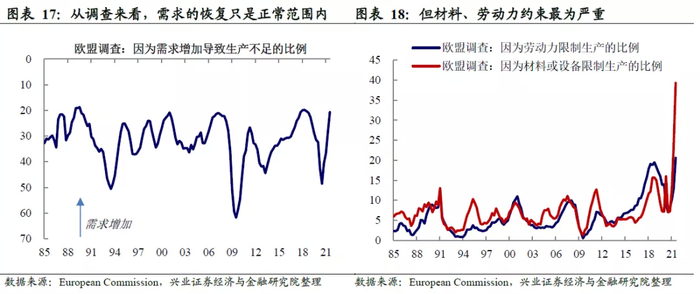 欧洲能源危机,只是其供应问题中的一环。我们在2021年6月15日发布的报告《除大宗外,全球供应链问题还出在哪里?》中曾提示,疫情以来,由于全球复苏的不均衡,本轮全球复苏中出现了罕见的供应链问题。过去一个季度,这种供应不足的问题愈演愈烈,而在欧美尤为突出,表现为欧洲、美国制造业PMI中的供应商交货处于极值的情况更为明显。从欧盟自身的调查来看,也是相似的结论。截至2021年3季度,欧盟需求的复苏只是在正常范围内,但劳动力短缺的约束已至历史高点,而材料或设备短缺的约束达到了20世纪80年代以来从未到达的高点。