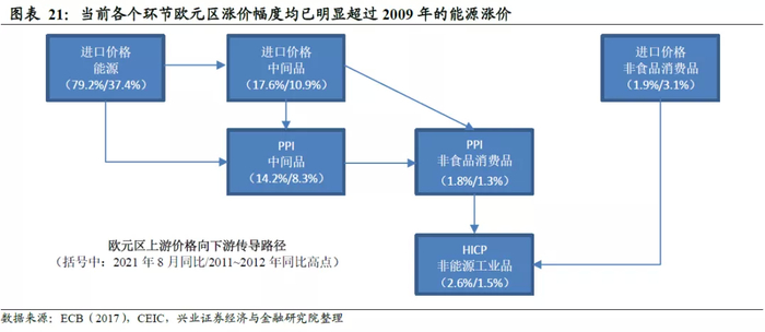 但商品端,供给不足的问题,导致上游向下游商品传导已非常明显。2021年初,能源价格大幅上涨之时,ECB(2021)通过分析历史经验时发现,上游涨价对下游的传导作用会有明显的滞后,PPI中间品到PPI非食品消费品的传导大概需要1个季度到半年,而PPI非食品消费品向终端(HICP非能源工业品)的传导还需要大概一年到一年半的时间。从2009-2010年那一轮大宗涨价来看,欧洲能源进口同比在2010年4月见顶,但那一轮终端价格同比见顶在2012年7月。