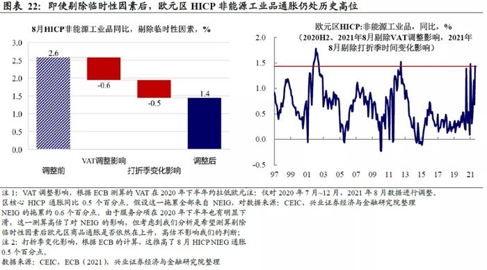但本轮的供给端压力是20世纪90年代之后前所未见,截至2021年8月,欧元区各环节同比已均在历史上95%分位数以上。尤其是,本轮终端(HICP非能源工业品)的反映速度明显快于以往周期,即使剔除两方面临时性因素(一是2020年下半年德国大幅下调VAT造成的低基数,政策于2020年底结束;二是欧洲打折季时间变化),欧元区商品通胀也已接近90年代以来的历史高点。考虑到上述ECB的研究,上游向下游的传导仍会持续一段时间。