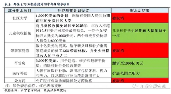 在其他方面,根据川阅全球宏观的整理,儿童税收抵免、平价房、医保扩展等被部分保留,免费社区大学、带薪家庭假、调降处方药价格、医保扩展到牙科及视力等项目被砍。