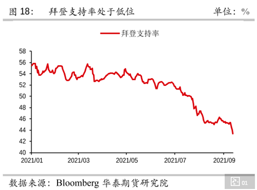 拜登的支持率从上任之后就持续下滑,由最高的56%,下滑至目前的41%,且近期继续呈现更快速的跳水。按照这个趋势,共和党人有机会在国会中重新获得多数席位。