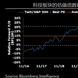 标普500科技板块的市盈率溢价继续扩大,或需下跌17个百分点,才能回到其5年平均水平。即便剔除苹果和微软,科技板块的估值仍远高于标普500的其他板块。