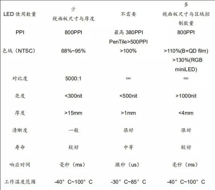 而Mini LED的工作温度范围在-40°C-100°C之间,同时驱动IC与LED芯片同一面,能提升散热能力,比OLED更耐温、屏幕使用寿命更长。