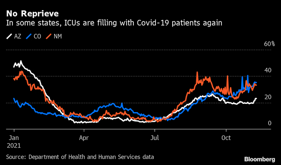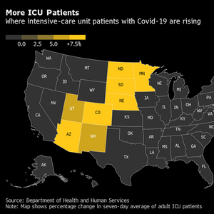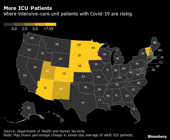 在12个州,Covid-19患者使用的重症监护床位比两周前有所攀升,这些州大多数位于南起亚利桑那州和新墨西哥州,北至明尼苏达州,跨越北美大平原的连续地带上。在西部几个州,许多医生和护士还没有从上一轮感染高峰中缓过气来。