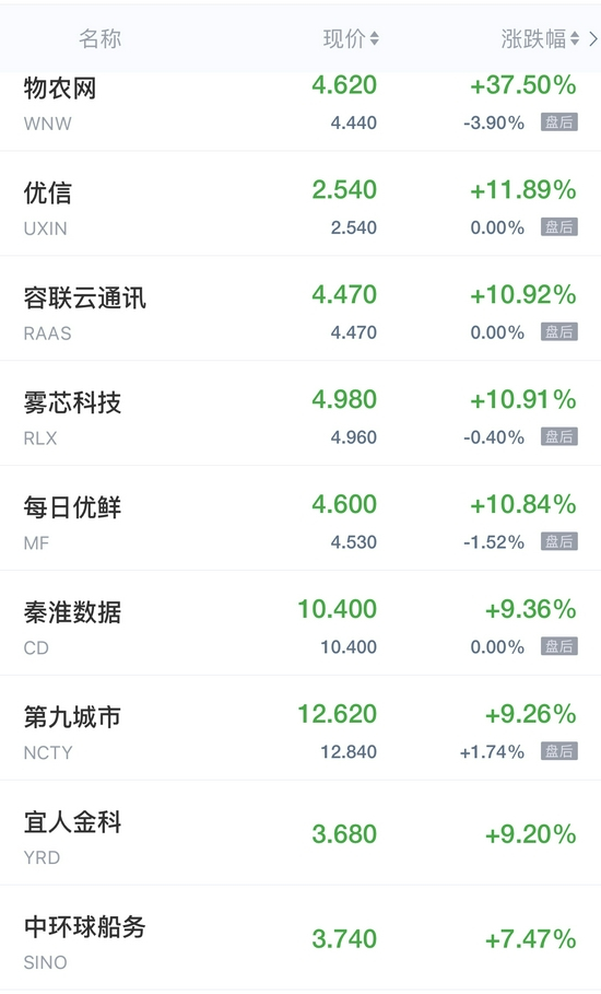 优信涨近12%,每日优鲜涨近11%,第九城市、宜人金科涨超9%,团车、中环球船务涨超7%,网易有道、迅雷涨超6%,斗鱼涨超5%,乐居、虎牙涨超4%,云米科技涨近4%,好未来、老虎证券、唯品会、世纪互联、微美全息涨超3%,欢聚集团涨近3%,拼多多、京东、陌陌、汽车之家、猎豹移动、途牛涨超2%,百度涨近2%,爱奇艺、新东方、哔哩哔哩、图森未来、腾讯音乐涨超1%。