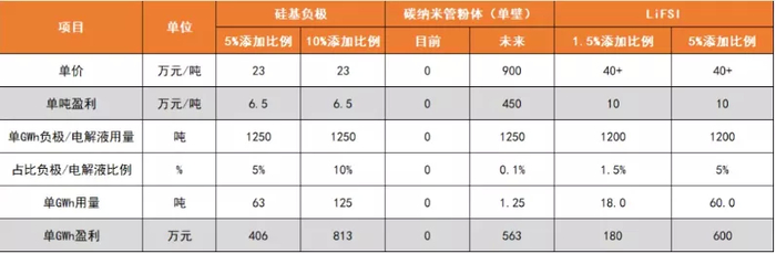 LiFSI:【天赐材料】。LiFSI具有较好的热稳定性、电化学稳定性、更高电导率,提升电池性能。目前LiFSI价格超过40万/吨,假设在电解液的添加比例5%,预计单吨净利润10万元,对应单GWh盈利600万元。