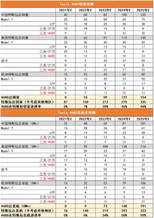 2170&4680假设:参照2170对18650的替代速度,因此假设22年以2170为主,23年后逐步转向4680,24年4680完全替代2170(Model 3除外)。海外进展将快于国内。