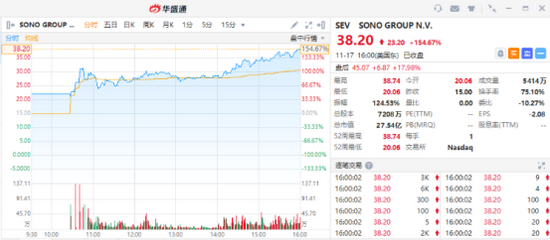 华盛通资讯,本周三(11月17日),德国太阳能汽车开发商Sono Motors(索诺汽车)的母公司Sono Group登陆纳斯达克,首秀炸场,因涨速过猛,盘中数次触发临时停牌。截至当日收盘,该股收涨超154%,最新股价报38.2美元,其IPO发行定价为15美元。