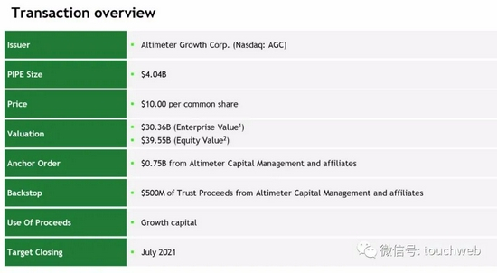 新公司市值约400亿美元,并获得约45亿美元现金,还包括40亿美元的PIPE( 上市后私募投资),参与者将包括贝莱德、富达、T. Rowe Price、摩根士丹利的Counterpoint Global基金、新加坡主权基金管理公司及淡马锡等机构。