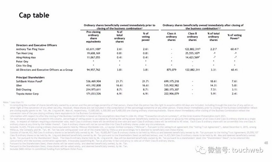 交易前,Anthony Tan Ping Yeow持股为2.6%,软银持股为21.7%,Uber持股为16.6%,滴滴持股为8.7%,Toyata Motor持股为6.9%。