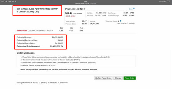 12月6日,段永平通过社交媒体账号“大道无形我有型”宣布“风投”拼多多,觉得拼多多对农产品的支持非常有意义。从他贴出的截图可以看到,段永平以单价4.9美元的价格,卖出了7000张拼多多2022年1月21日到期、行权价为50美元的看跌期权。由于1张期权代表100“股份”,因此这笔投资的“权利金”为4.9*100*7000=343万美元。