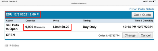 12月8日,段永平再次透过“大道无形我有型”透露,以同样的方式卖出了9999张新东方2021年12月31日到期、行权价为2美元的看跌期权,期权单价为0.2美元/张,意味着这次投资的“权利金”为0.2*100*9999=199980美元。