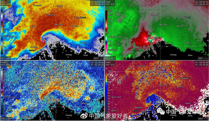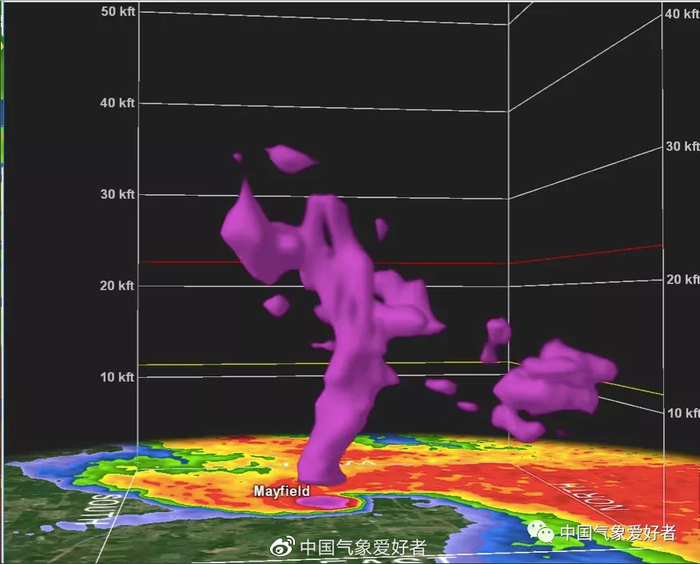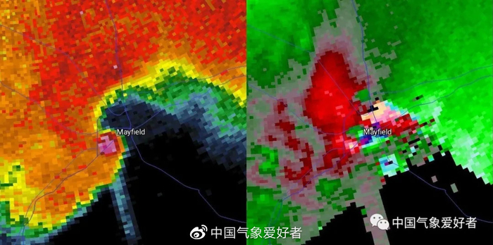 在mayfield,市法院被削去两层,一家工厂彻底夷平,工厂外停车场的数十辆汽车被扔出数百码,很多车辆叠罗汉,有些甚至都难以辨识。位于40英里外的双偏振雷达监测到,龙卷风在大约500米的高空径向速度超过了100米/秒,是双偏振雷达观测以来的最高纪录。初步判断,此龙卷风至少达到EF4级别,很有可能达到了最高的EF5级。
