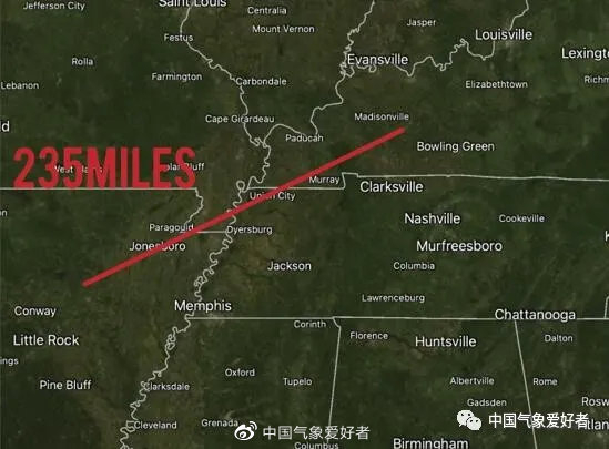 二是罕见的持久性:上述两个龙卷风在3个半小时的时间内行进总距离达到235英里(376公里)。一般而言,龙卷风往往只会行走10,20km,维持时间不过5-10分钟,而这两个龙卷风将平均行进距离翻了15-30倍,维持时间翻了20-40倍,可谓继1925年美国“三州龙卷”后仅见。