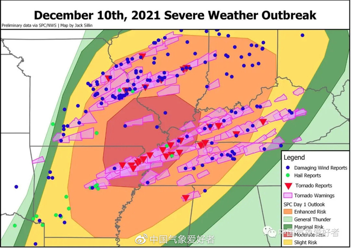 北京时间12月11日白天(美国中部时间12月10日夜间),美国中部发生大规模强对流天气,并出现龙卷爆发。据不完全统计,至少有32个龙卷在10个州出现,其中阿肯色、密苏里、田纳西和肯塔基四州受灾严重。