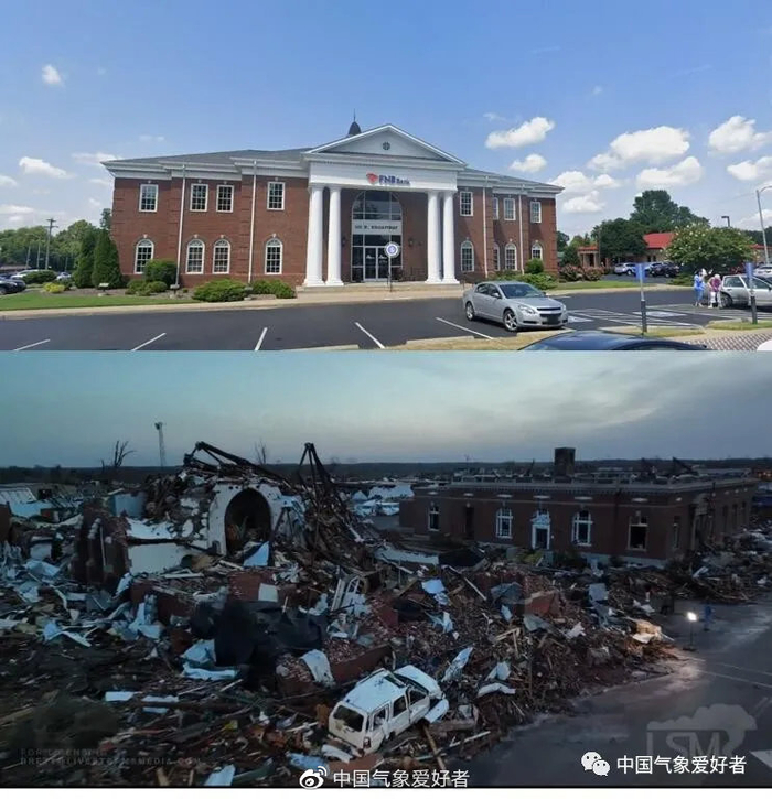 龙卷重灾区-mayfield的某银行前后对比,来自美媒