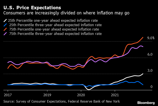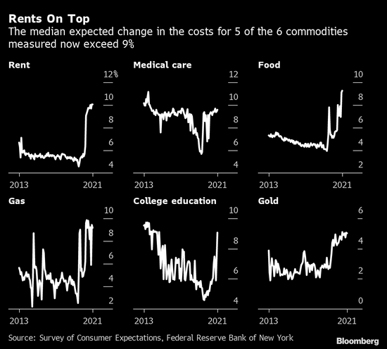 根据调查,美国人预计租金和食品等物价在未来一年会加快上涨,这些支出占据了家庭支出的很大一部分,而且不易被替代。对租金、食品、大学学费、医疗保健和汽油价格涨幅的预期均高于9%。