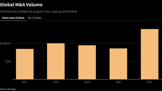 全球并购(M&A)活动在2021年打破了历史纪录,因大量资本和天价估值助长了疯狂的交易水平。