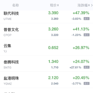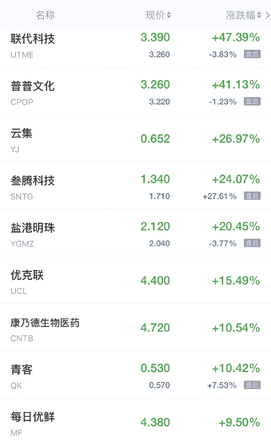 联代科技涨超47%,普普文化涨超41%,云集涨近27%,叁腾科技涨超24%,每日优鲜涨超9%,途牛、人人公司、极光涨超2%,荔枝涨超1%。