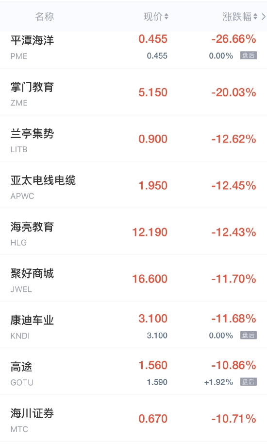 掌门教育跌超20%,海亮教育、兰亭集势跌超12%,亿邦国际、聚好商城跌超11%,高途跌近11%,海川证券跌超10%,贝壳、讯鸟软件跌超9%,网易有道跌超8%,世纪互联跌超7%,爱奇艺、前程无忧、老虎证券、富途控股跌超6%,新东方、雾芯科技跌近6%,中网载线、斗鱼、虎牙、名创优品跌超5%,欢聚集团跌近5%,优信跌超4%,哔哩哔哩、金融界、唯品会跌近4%,拼多多、百度、汽车之家、微美全息跌超3%,阿里巴巴跌超2%,网易、携程跌近2%,