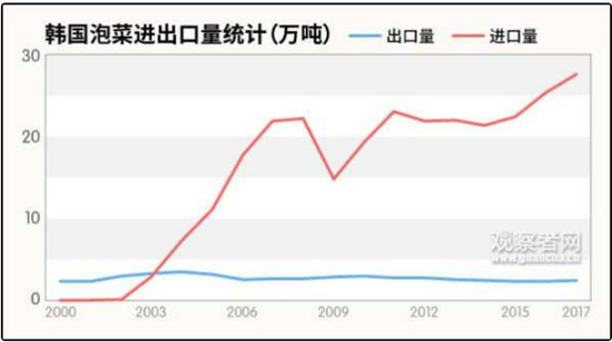 而从2003年开始,韩国泡菜的进出口量就逐渐不平衡了起来,特别是2017年,自己出口了2万吨,而却进口了快30万吨。