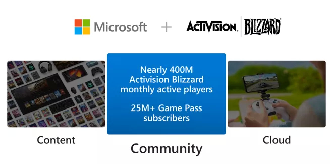 内容:从主机、PC 和移动设备上的内容开始。动视暴雪拥有一些世界上最具传奇色彩的游戏,包括价值数十亿美元的特许经营权,如使命召唤、糖果粉碎、魔兽世界。Activision Blizzard 的产品组合增加了我们自己的第一方阵容,从Minecraft到Forza再到Halo ,以及我们在去年收购 ZeniMax Media 时获得的标志性特许经营权,包括Fallout 、Doom和Elder Scrolls 。