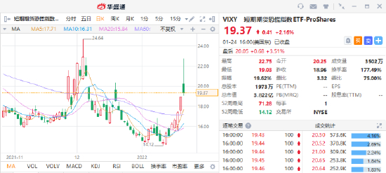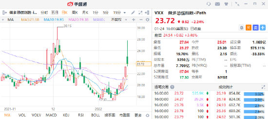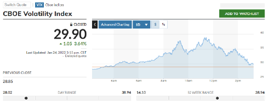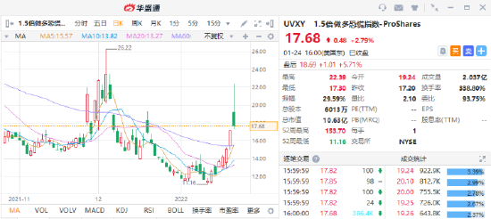 华盛通资讯,周一,俄乌边境局势急剧升温震动市场,美股上演惊魂一夜“深V”行情,道指盘中一度跌超千点,纳指跌幅一度近5%。恐慌指数VIX在当日一度触及38.94,创下2020年10月以来的最高水平。
