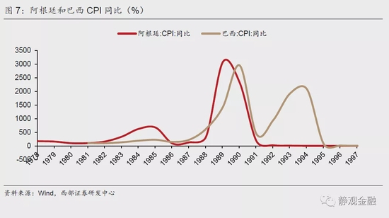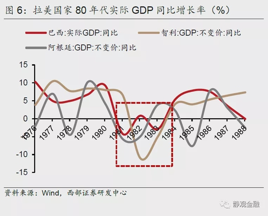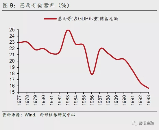 拉美经济体经济衰退,陷入了中等收入国家陷阱。1981年阿根廷和巴西实际GDP同比滑落5.69%和4.25%,次年智利以11%的跌速加入,巴西和智利的经济衰退持续到1984年,而阿根廷的经济在1986年一轮短暂的复苏后再次滑落,直到90年代初才开始恢复趋稳。同一时期,拉美国家的债务问题也触发了严重的通货膨胀危机,阿根廷和巴西在80年代的通胀率很少低于100%,而且在80年代末和90年代初更出现了高达3000%的通胀率,极大地威胁了货币系统的稳定性,同时也进一步恶化了储蓄率不足、经济依赖外部融资的问题,并在美元和美债收益率的同步走高下触发危机,陷入了类似的恶性循环。墨西哥亦从1981年开始经济彻底失速,陷入了长达7年的低增长和高通胀,期间通货膨胀率基本维持在50%以上,且曾两轮突破100%,实际GDP则在1983和1986年分别出现4.2%和3.75%的负增长;高通胀反过来也对储蓄率造成不利影响,进一步加重国民经济的外部依赖性,储蓄占GDP比例从1983年的24.99%跌落到1993年的15.64%。