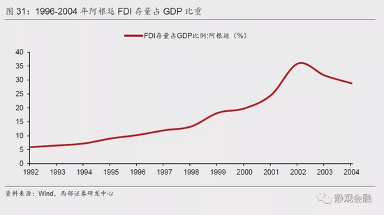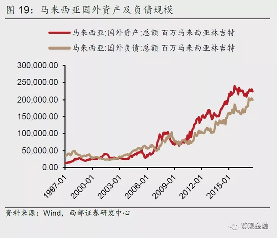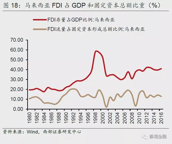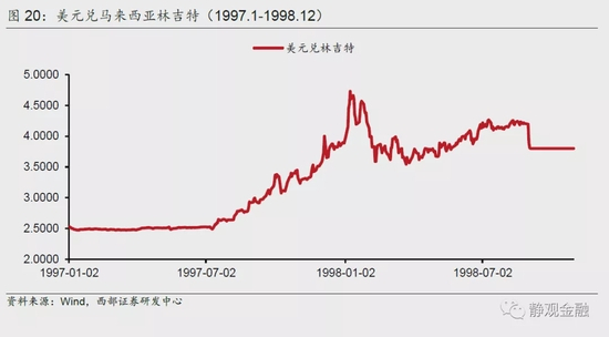 再以马来西亚为例。亚洲金融危机爆发前,马来西亚FDI存量占GDP比重已经高达33%,且国外资产规模远低于国外负债(净负债约占GDP比重80%),这表明一旦马来西亚汇率发生波动将对国家资产负债表结构产生较大冲击。1994年美联储启动加息周期,初期美元指数仍处于贬值状态,林吉特仍在升值,FDI仍净流入马来西亚。但1996年开始美元和美国利率水平均上升,在林吉特受到国际投资者狙击后,汇率贬值导致马来西亚对外负债规模(美元计价)相对GDP(林吉特计价)比重被显著放大;FDI存量(美元计价)占GDP(林吉特计价)比重大幅走高,1998年该指标曾超过60%。