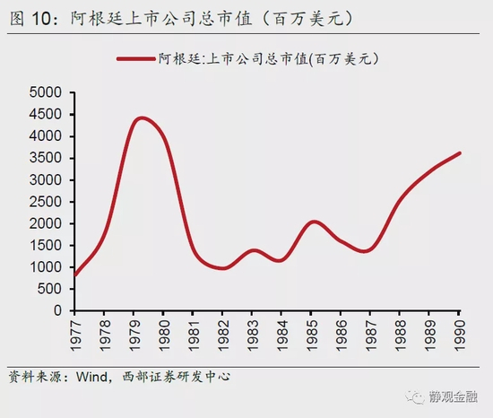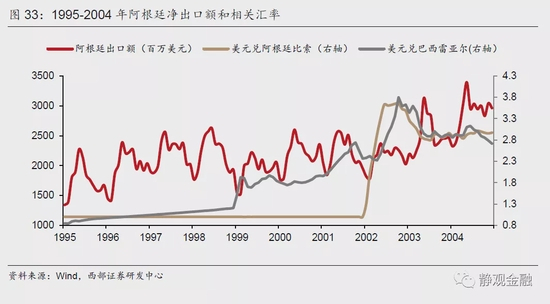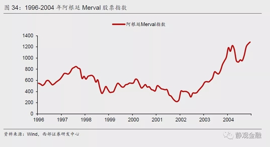 强势美元面前,阿根廷的主要贸易竞争对手巴西选择了将本币雷亚尔对美元贬值,阿根廷却只能按兵不动,这进一步加大了阿根廷在出口上的汇率劣势。最后,阿根廷在1999年进入了萧条期,政府在2001年停止偿付债务,并在2002年被迫将比索与美元解锚,导致了比索贬值超过70%,以及紧随其后的30%通货膨胀率。阿根廷的主要股票指数Merval表现出了较强的预警性,在1997年经济尚未出现疲态时就开始下行,并在2002年汇率解锚前达到低点,跌幅约70%。