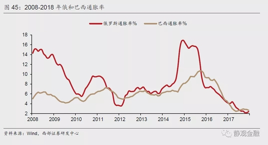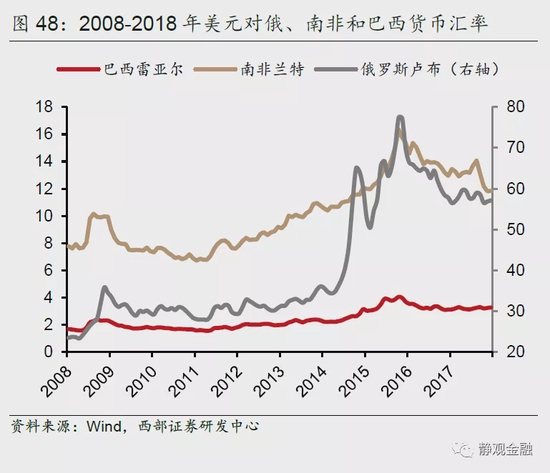 对于巴西、南非、俄罗斯等资源型新兴市场而言,美元升值意味着资源品内在隐含的美元价值下降,削弱资源国的全球竞争力,推动资源国汇率贬值。本币大幅贬值必然带来输入型通胀,因此强美元环境下,资源型国家往往出现高通胀甚至恶性通胀,经济处于滞胀期。企业盈利能力趋弱、国内融资成本却大幅攀升。弱美元周期则逻辑相反:资源品内在隐含的美元价值回升、资源国的全球竞争力增强带来企业盈利改善,汇率升值降低输入型通胀风险,内部融资成本相对回落。