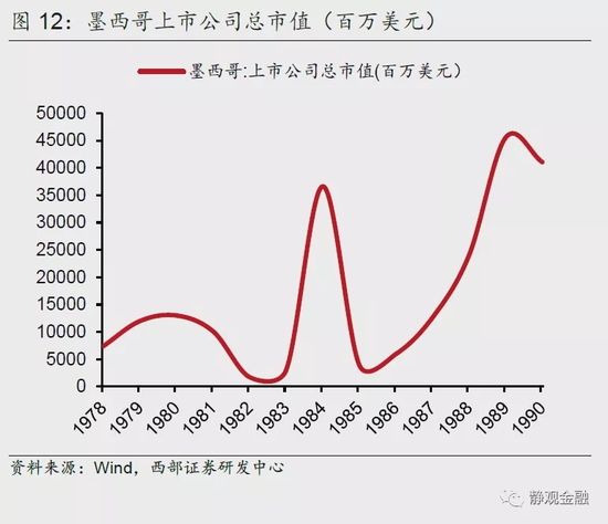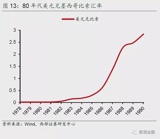 与阿根廷等国金融市场的动荡类似,墨西哥的上市公司从1980年开始的两年间同样损失了超过80%的市值,并在1984年前后经历了一轮“过山车”式起伏。通胀压力下,墨西哥比索在80年代同样对美元贬值了上百倍,从一种单位价值极高的货币变得和美元量级类似,直到单位价值被美元反超。