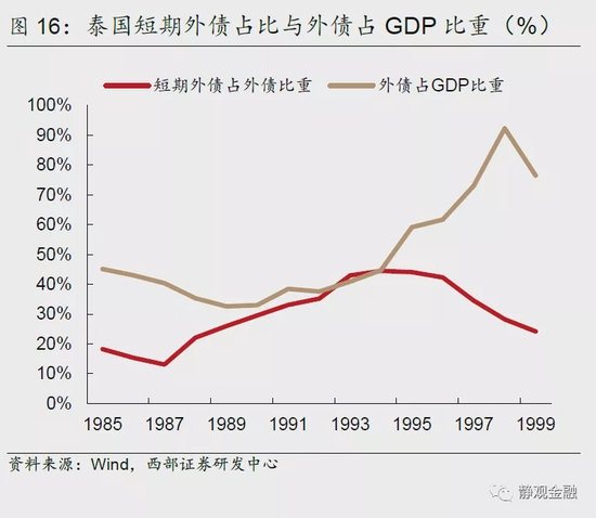 与80年代的拉美危机的背景类似,进入90年代,发展中国家争夺外资的竞争愈演愈烈。以泰国为例,其经常项目的巨额逆差及财政收支的巨额赤字,使得泰国除了进一步放开外商投资范围外,过分依赖于举借外债来弥补资本缺口,这使其外债总额飙升,外债结构严重失衡。据统计,泰国外债由1992年底的396亿美元增加到1996年底的930亿美元,相当于GDP的50%,其中短期外债约占外债总额的45%左右。为偿付这种巨额债务,泰国必须保持年15%以上的出口增长率和不断的外资流入,而与此同时,东南亚国家的外储水平在90年代前期始终处于较为薄弱的水平,这也为其本币价值的崩溃埋下了祸根。