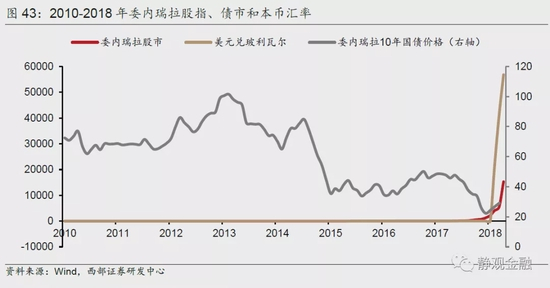 由于原油是委内瑞拉和俄罗斯的主要经济来源,因此不仅油价萎靡对上述两国、尤其是委内瑞拉形成了经济冲击,同时美元升值又压迫了其本币,形成了“油价下行→经济疲软,外汇储备受损→汇率(大幅)贬值→恶性输入型通胀+国别信用风险增加→股债汇三杀”的局面。