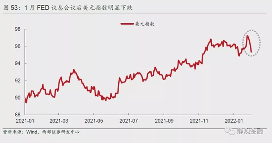 近期一些迹象进一步支持了这一逻辑。首先,1月31日多位地方联储主席出面打压3月加息50BP的预期,可谓“鹰中有鸽”。当下是美联储最鹰阶段,随着中期选举到来美联储势必逐步转鸽。其次,2月3日英央行继上次加息25BP后再度加息25BP,并停止对到期资产再投资,减少英国政府债和公司债购买。最后,欧央行态度开始转鹰。2月3日欧央行行长拉加德放弃此前“2022年加息可能性非常低”的说法,强调“通胀是当务之急”。英国加息梅开二度、美国加息箭在弦上,离欧央行加息(或者加息预期升温)也就不远了。1月27日美联储议息会议后美元指数也从97.23下跌1.94%至95.34。