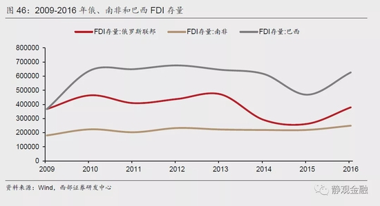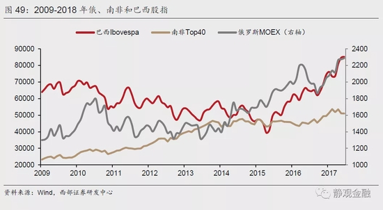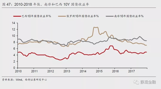 除了前文提及的俄罗斯以外,2014年开始的强美元背景下,伴随国际油价和其他大宗商品价格的下跌,巴西和南非也遭遇了经济失速。其中,俄罗斯和巴西两国衰退比较严重,出现实际GDP负增长,而随着同期美元仍不断升值,俄罗斯卢布贬值幅度达50%,进一步引发通胀高企和资本撤离,而名义股指在通胀下拉高,但没有实际意义。此外,三个国家同时出现国债收益率上升现象,其中南非还遭到评级机构主权信用降级。