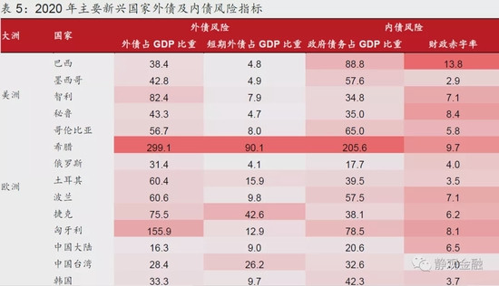 根据IMF统计,1995年以来新兴市场的两次大规模资本流出分别发生在金融危机和疫情暴发时。金融危机期间的单月最大资本流出额为445.8亿元(2008年10月),疫情暴发时的单月最大资本流出额为872.8亿元(2020年3月)。以外债占GDP比重和短期外债占GDP比重作为衡量外债风险的指标,2020年多数新兴国家外债风险指标相对于2008年金融危机和历次新兴危机时的水位偏低,希腊(尤其)和捷克偏高。以政府杠杆率和财政赤字率作为衡量内债风险的指标,同样发现目前多数国家相比2008年金融危机和历次新兴危机时处于安全区间,但希腊偏高。