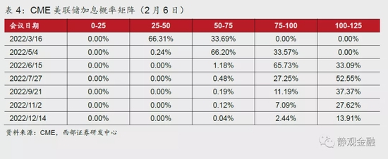 连续加息或导致年内美债曲线发生倒挂,年内3次加息或为大概率。正如我们在1月27日的报告《怎么看美联储能够实现的加息节奏?》中提到的,1月议息会议美联储传递的信号是3月加息,并在首次加息后开始讨论缩表,至少讨论一次的措辞表明美联储或将于6月启动缩表计划。假若以单次加息25BP为标准,2月4日2年期美债收益率站上1.3%或已隐含了美联储的4次加息。假若以CME为标准,今年加息3次的概率是最高的。也就是说,目前市场“感知”到的今年美联储加息次数为3-4次。同时,2月4日 10年与2年期美债收益率差值已经降至62BP,加上10年期美债收益率的不确定性,一旦年内美联储加息超过3次且暗示明年继续加息3次则年内美债曲线就有倒挂风险。因此,能否连续加息除了受通胀、就业等经济因素影响外,美联储可能还会考虑美债曲线。此外,正如我们在2月4日的报告《美国通胀拐点:早则Q1;迟则Q2》指出,美国通胀拐点大概率出现在H1,早则Q1、迟则Q2,进而H2美联储加息紧迫性料将有所缓和。目前看,3月加息、6月或有加息,Q3利用缩表代替更多次加息防止美债曲线倒挂,随后在中期选举后的12月再度加息的概率或最高。